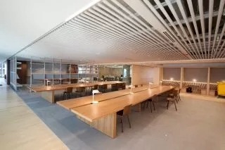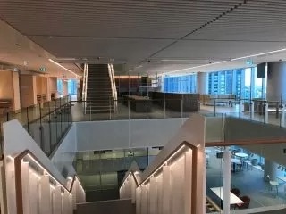 Airy interiors maximise the natural light. There are 644 bike parking spaces and end-of-trip facilities for those wishing to cycle to work.  The building also offers parent rooms, large studios for exercise, multi-faith rooms, and spaces for quiet contemplation.